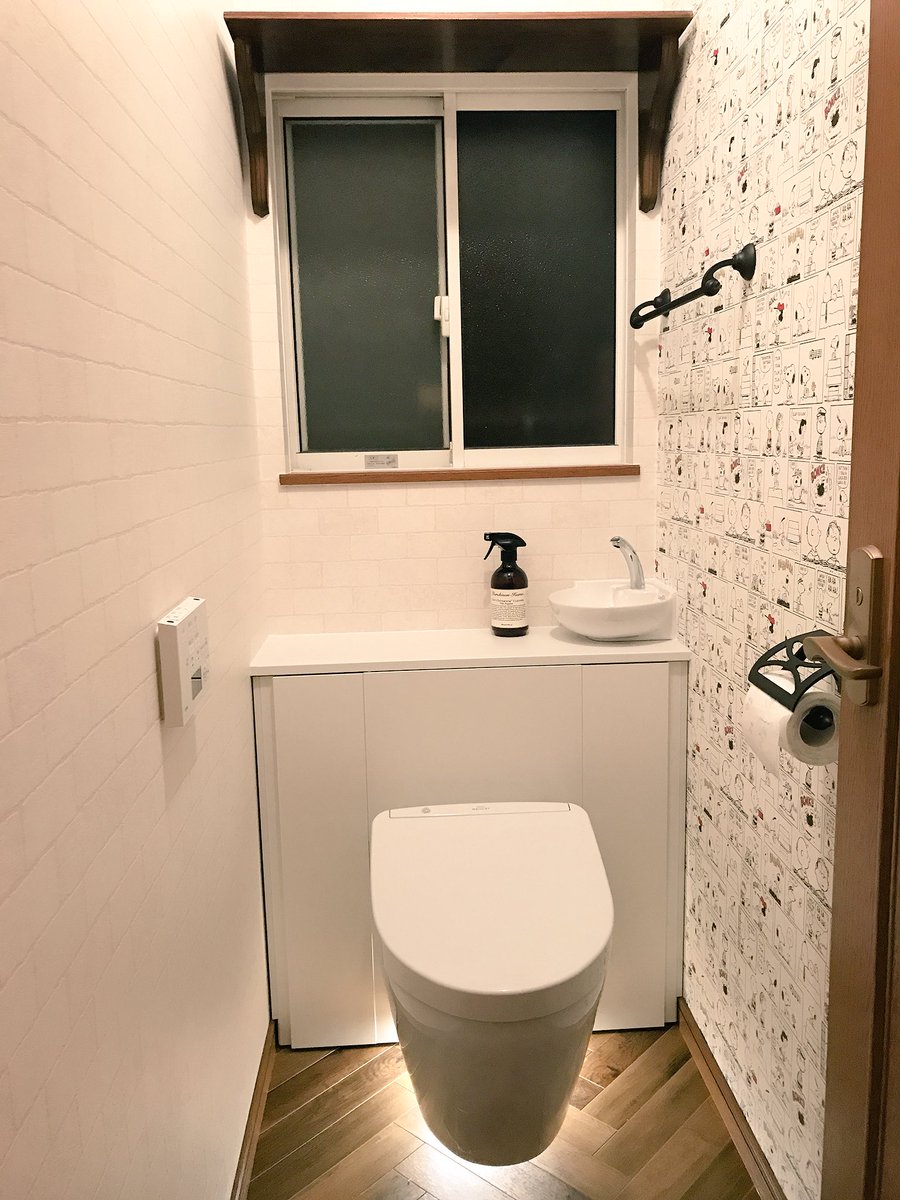ビンテージな西海岸風トイレ スヌーピーの壁紙でかわいい空間に 高砂市t様邸 トイレリフォーム